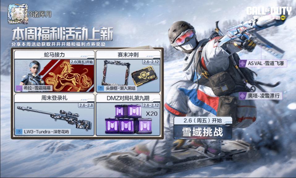 《使命召唤手游》X好游快爆联动即将开启瘦普带着福利提前来“爆”一起来看看吧~2月11日,《使命召唤手游》X好游快爆 将开启破次元联动。首先登场的活动是【次元爆裂】,活动期间(2月11日-3月15日),战士们每日登录游戏并完成指定任务,即可获得史诗级武器MG42-潮光爆能、史诗级角色蔷薇刺客-澄浪霞音等精美联动奖励啦!除此之外,还有很多福利活动即将开启,和本汪一起来看看吧——● 【周福利