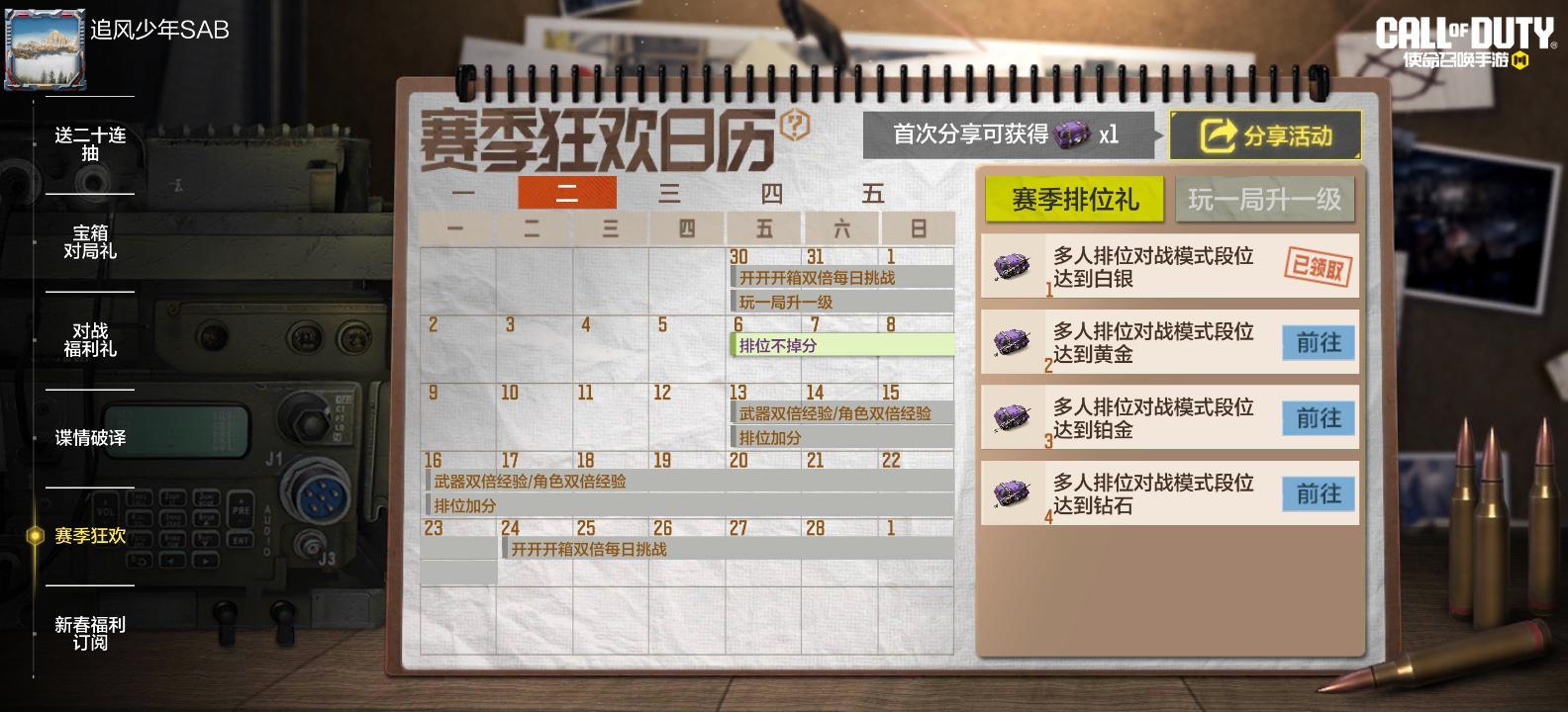 使命联欢晚会第3弹重磅来袭 五大福利齐放送,这个新春究等你 财来 来财 把财塞进你口袋 小曲立刻唱起来—— 过年啦过年啦! CODM把财发: 一把免费开开开箱新神话 七把神话免费体验卡 新春点赞登录别落下! 联动啦联动啦! 五路财神博物馆,好游快爆送武器 这次福利究等你来拿! 本期节目:《把财塞进你口袋》现已上线 新春五大福利整合放送,点这里了解怎么来财——