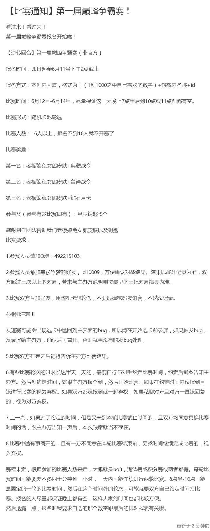 比赛结束啦!恭喜以下三位选手!冠军:炸毛盖亚军:MTHG-情绪季军:速冻水饺—————————分割线——————————你是否曾有以下的想法:日复一日的刷星太无聊?等级压制不服气?想证明自己的实力?与大佬们同台竞技,检验自己的组卡实力与对局细节,赢取限定皮肤与水晶,就在此刻!(注:图片下方有报名须知哦)报名须知:1.此贴评论仅限报名,请勿回复其他无关内容。2.参赛者需保证