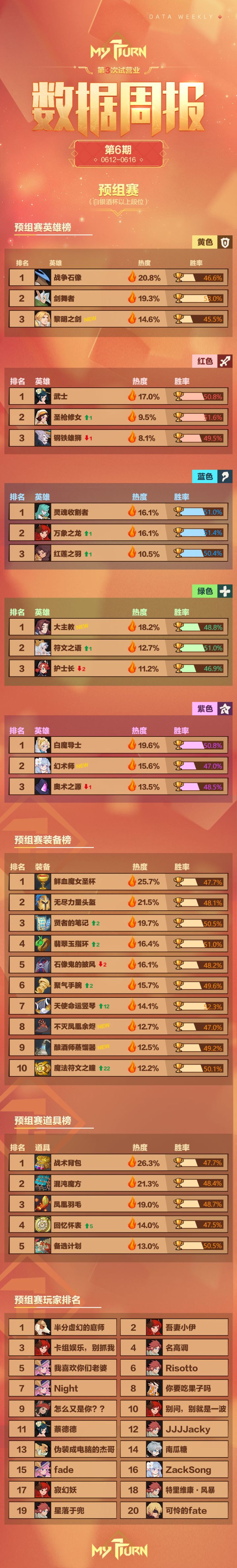 回合旅店的客人们,大家好!第3次试营业0612-0616第6期游戏数据周报更新啦!新英雄上线后人气很高吖~黎明之剑、大主教、幻术师都榜上有名!那么整体数据排名上有什么变化呢?来一起看一看吧~~