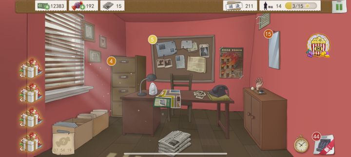 游戏体量轻,单个剧情案件需要5-15mins,剧情案件需要通过日常小任务(8-10个单个的益智游戏)积攒名声(报纸)解锁,后续对线索素材收集的要求会高很多,但侦探可以通过给办公室购入证物箱,书柜,办公桌或通过破案收集经验点满侦探的技能树来减少难度,实在不行可以使用糖果或货币来购买探案物资。