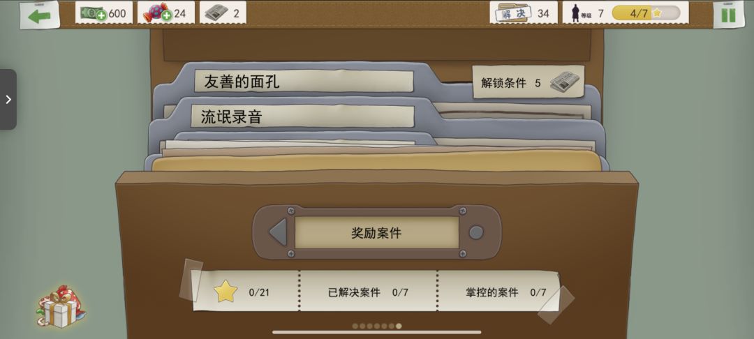 自己一开始摸索找了好久才发现奖励档案的位置,也做个小小的不算攻略的攻略。 找到档案柜,会有档案,#又一个案子解决了 档案章节名称两边有箭头,点击右边箭头会换章节,然后一直往后点就好啦,在章节六后面,就是奖励档案。