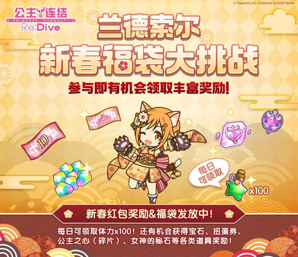 亲爱的各位骑士君: 新春特别活动「兰德索尔 新春福袋大挑战」已开启,大量新春红包与福袋正在发放中!登录游戏完成签到挑战即可领取体力×100以及其他特别道具,还请骑士君们不要错过! ■活动时间 2/6 10:00~2/19 04:00 ■活动对象 玩家等级≥15的所有骑士君 活动详细说明请见活动地址:http://game.bilibili.com/pcr/newyearevent2021/ 今后也