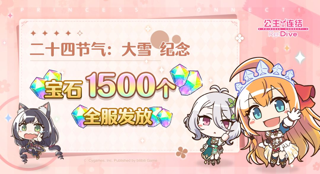 亲爱的各位骑士君: 大雪至,岁暮天寒,顺问冬安。今天是二十四节气:大雪到来的日子,我们准备了一份礼物,已发放至礼物盒内,请留意领取哦~♪ ■ 发放内容 免费宝石×1500个 ■ 发放对象 2024年1月7日23:59前完成注册且玩家等级≥4级的全体骑士君 ■ 领取期限 2023年12月7日 12:00~2024年12月7日 23:59 今后也请多多支持《公主连结Re:Dive》!