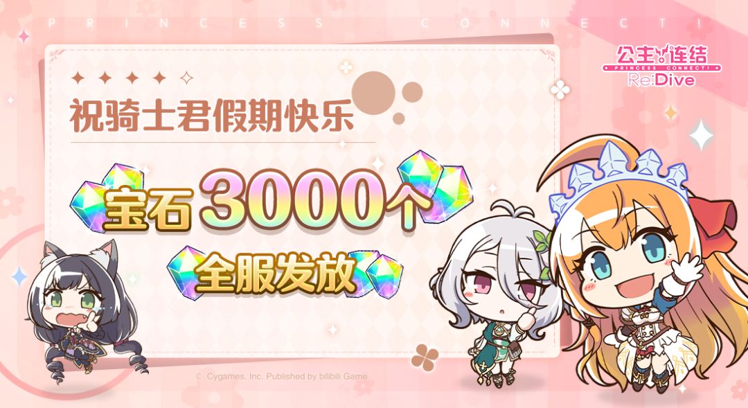 亲爱的各位骑士君: 小长假已到来,各位骑士君快乐度假的同时,也请留意出行安全哦~! 我们为骑士君们准备了一份假期礼物,请留意查收。 ■ 发放内容 免费宝石×3000个 ■ 发放对象 玩家等级≥4的全体骑士君 ■ 领取期限 2023年10月1日 12:00~2024年10月1日 23:59 今后也请多多支持《公主连结Re:Dive》!