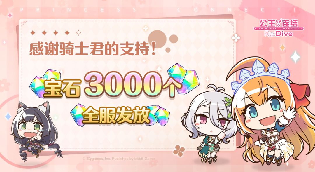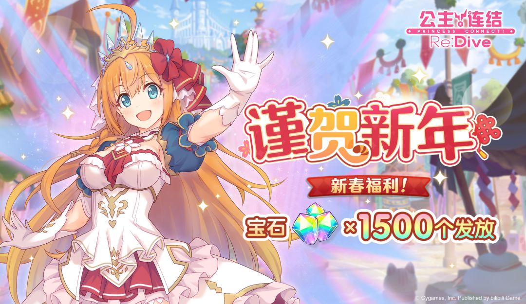 亲爱的各位骑士君: 感谢骑士君一年以来对于《公主连结Re:Dive》的关注与支持~新的一年即将到来,祝愿各位骑士君虎年大吉,万事如意! 我们准备了新春特别福利「免费宝石×1500」,将发放至游戏内的礼物箱,还请及时领取哦~ ■ 发放时间 1月31日 20:00 ■ 发放内容 免费宝石×1500 ■ 发放对象 玩家等级≥4的全体骑士君 ■ 领取期限 1月31日 20:00~2月27日 23:59 今