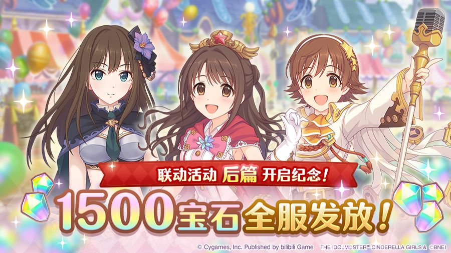 亲爱的各位骑士君: 为庆祝 #公主连结# × #偶像大师 灰姑娘女孩 星光舞台#联动活动的开启,我们为骑士君们准备了联动活动纪念礼物——「免费宝石×1500」! 礼物已发放至礼物箱,还请及时领取哦~ ■ 发放时间 2022年3月12日 15:00~2023年3月12日 14:59 ■ 发放内容 免费宝石×1500个 ■ 发放对象 截至2022年4月12日 23:59 玩家等级≥4级的骑士君 ■ 领