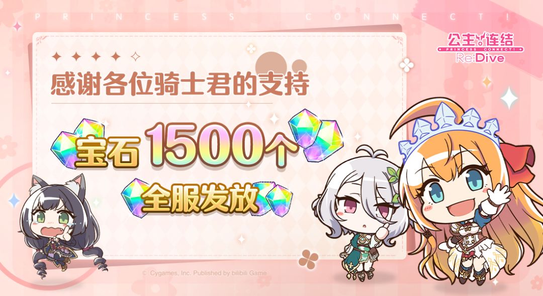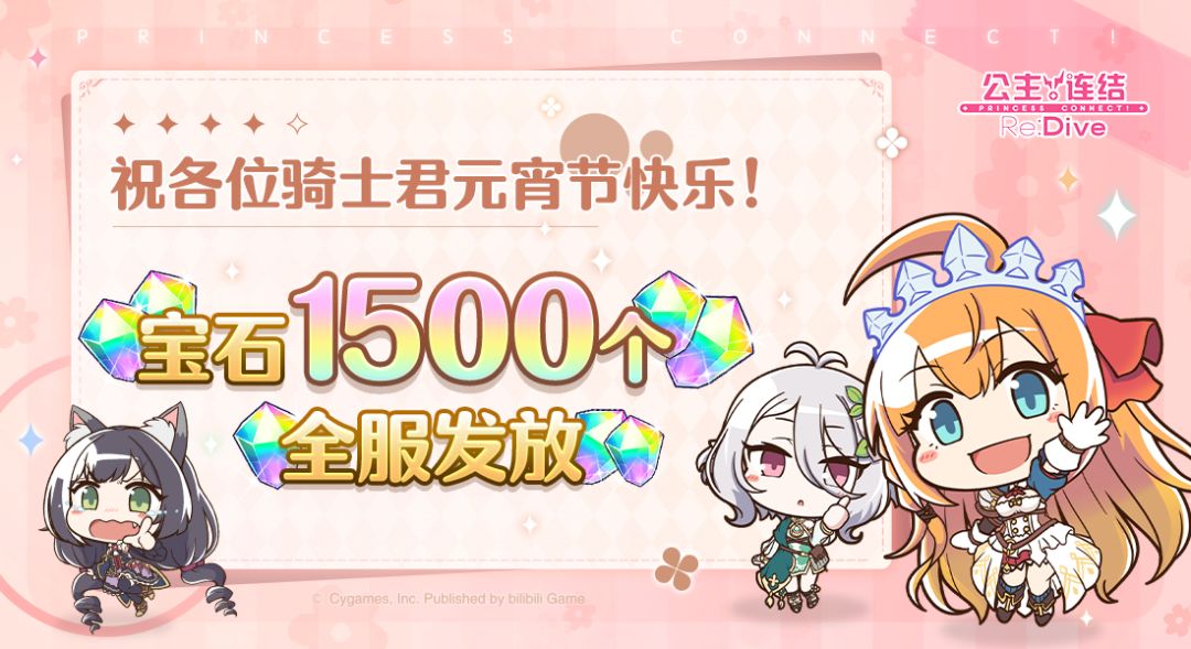 亲爱的各位骑士君: 元宵佳节已至,祝各位骑士君阖家欢乐,团团圆圆。我们为各位骑士君准备了一份节日礼物,敬请留意查收~! ■ 发放内容 免费宝石×1500个 ■ 发放对象 玩家等级≥4的全体骑士君 ■ 领取期限 2月5日12:00~2月12日23:59 今后也请多多支持《公主连结Re:Dive》!