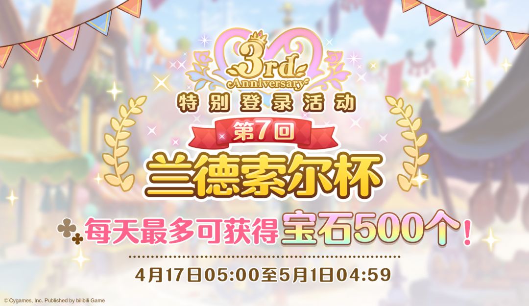 【#公主连结3周年# 庆典活动】 亲爱的各位骑士君: 4月17日 05:00起,游戏内将开展「3周年纪念兰德索尔杯特别登录奖励活动」! 活动期间内登录游戏,每日可进行一次「兰德索尔杯」竞赛挑战!根据排名的不同可以获得相应数量的宝石奖励,还请骑士君们不要错过哦! ■活动时间 4/17 05:00~5/1 04:59 ■注意事项 1. 活动期间最多可以获得14天「3周年纪念兰德索尔杯特别登录奖励活动」