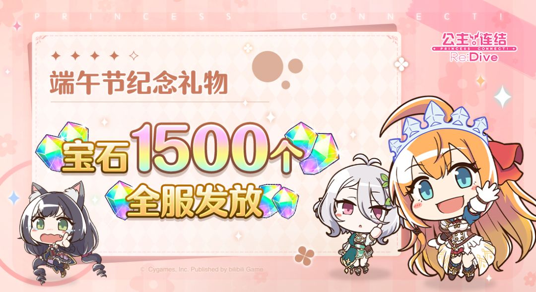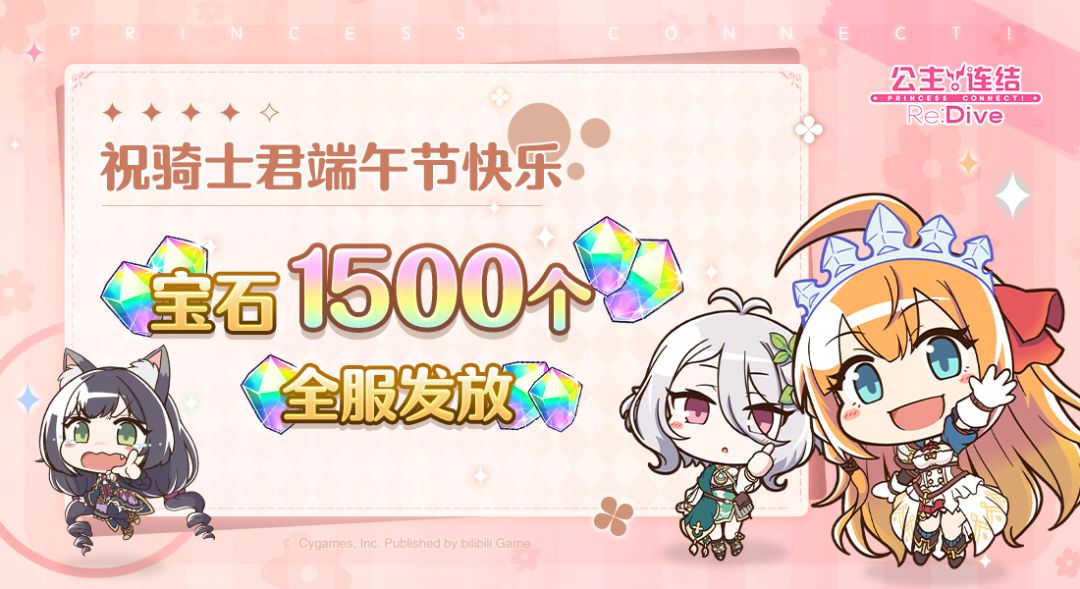 亲爱的各位骑士君: 粽叶飘香,端午节已经到来,祝各位骑士君端午安康~我们为各位骑士君准备了一份节日礼物,请留意查收哦~ ■ 发放内容 免费宝石×1500个 ■ 发放对象 玩家等级≥4的全体骑士君 ■ 领取期限 6月3日 12:00~7月31日 23:59 今后也请多多支持《公主连结Re:Dive》!