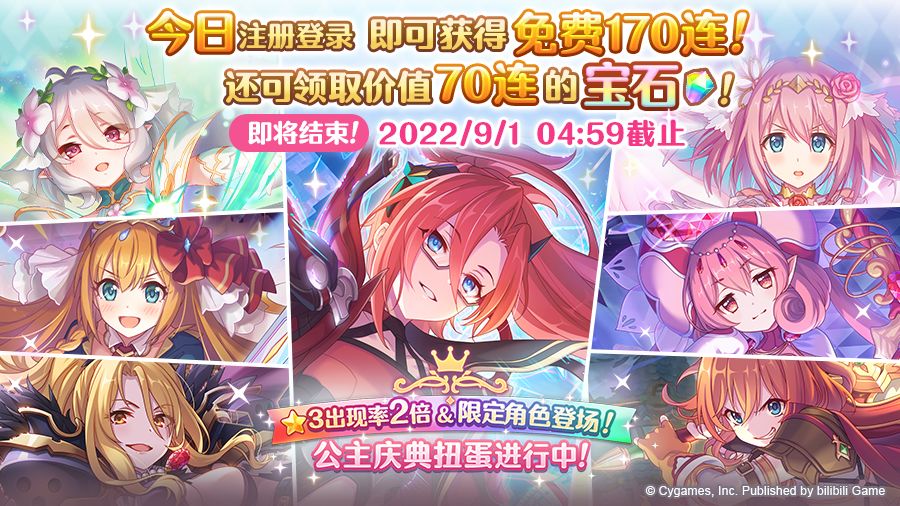 【免费170连 即将结束!】 8月31日维护后,游戏内已开启★3角色出现概率2倍的「公主庆典扭蛋」,期间限定角色也会在扭蛋中限时登场! 现在下载#公主连结#,完成注册并登录游戏,即可免费抽取170连「公主庆典扭蛋」,此外还可获得价值70连的宝石,还请不要错过! 快快开启兰德索尔的冒险之旅吧~ ■注意事项 1.「免费170连」为8月15日05:00起游戏内开展的「每日一次免费十连」庆典活动,活动详情