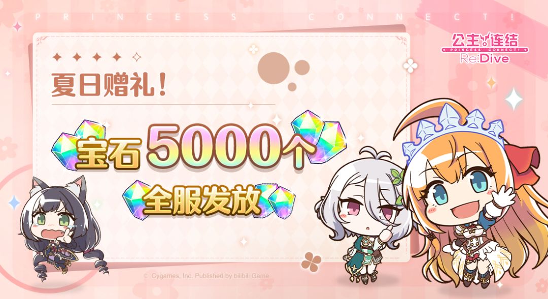 亲爱的各位骑士君: 炎热夏日仍未结束,请大家注意降温消暑哦~为感谢各位骑士君一直以来的支持与热爱,我们准备了一份谢礼,敬请留意查收! ■ 发放内容 免费宝石×5000个 ■ 发放对象 8月21日 23:59前在游戏内创建角色且玩家等级≥4的骑士君 ■ 领取期限 2022年7月21日 15:00~2023年7月21日 23:59 今后也请多多支持《公主连结Re:Dive》!