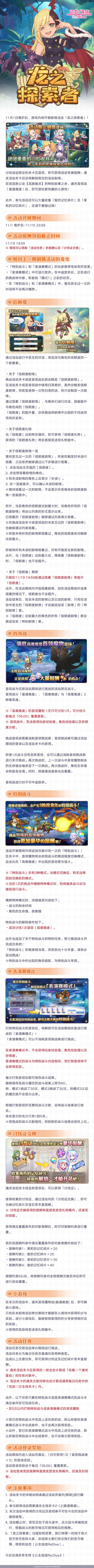 亲爱的各位骑士君: 11月1日维护后,游戏内将开展剧情活动「龙之探索者」! 并将同步开展「活动关卡玩家经验值获得量1.5倍庆典」! ※庆典开展时间及详情请见后续官方公告。 ■活动时间 11/1 维护后~11/15 23:59 讨伐活动限定的关卡及首领魔物,即可获得活动专属报酬,还可以解锁限定的活动剧情哦。 活动详情敬请查看下方长图↓ ■注意事项 1. 参与剧情活动需要通关主线关卡2-12(普通难度