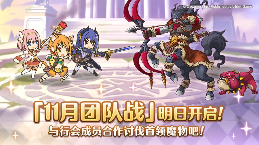 亲爱的各位骑士君: 「团队战」将于11月25日05:00正式开展! 团队战中将会出现非常强力的首领魔物,与行会成员同心协力进行挑战吧! 团队战结束后,将对团队战期间各行会对首领魔物造成的伤害总值进行排名。 根据排名区间的不同,将对行会全员发放相应数量的报酬! ■活动时间 11/25 05:00~11/29 23:59 有关团队战详情还请参阅→https://www.bilibili.com/rea