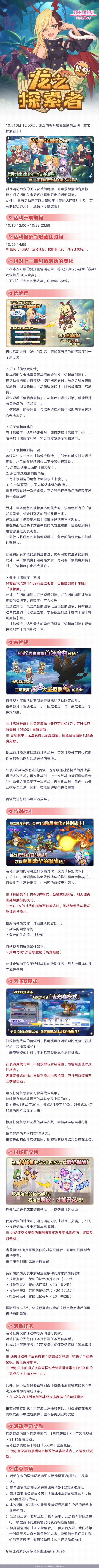亲爱的各位骑士君: 10月16日12:00起,游戏内即将开展复刻剧情活动「龙之探索者」! 并将同步开展「活动关卡玩家经验值获得量1.5倍庆典」! ※庆典开展时间及详情请见后续官方公告。 ■活动时间 10/16 12:00~10/23 23:59 讨伐活动限定的关卡及首领魔物,即可获得活动专属报酬,还可以解锁限定的活动剧情哦。 活动详情敬请查看下方长图↓ ■注意事项 1. 参与剧情活动需要通关主线关