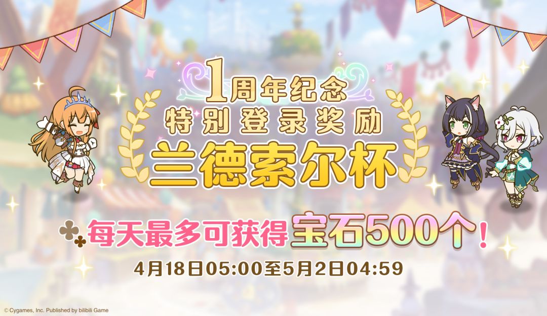 【1周年庆典纪念活动】 亲爱的各位骑士君: 4月18日 05:00起,游戏内将开展「1周年纪念兰德索尔杯特别登录奖励活动」! 活动期间内登录游戏,每日可进行一次「兰德索尔杯」竞赛挑战!根据排名的不同可以获得相应数量的宝石奖励,还请骑士君们不要错过哦! ■活动时间 4/18 05:00~5/2 04:59 ■注意事项 1. 活动期间最多可以获得14天「1周年纪念兰德索尔杯特别登录奖励活动」的奖励。 ※