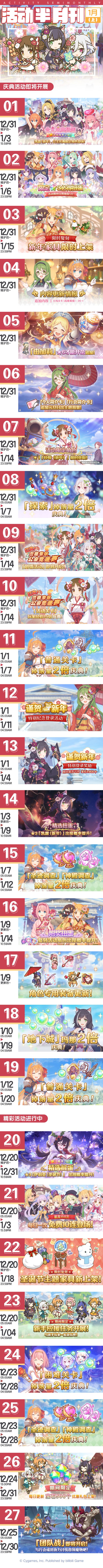 亲爱的各位骑士君: 活动半月刊(一月上)已公布,请骑士君留意一月上旬常规活动的开展时间哦~ ※各活动详情敬请留意后续官方公告。 今后也请多多支持《公主连结Re:Dive》!