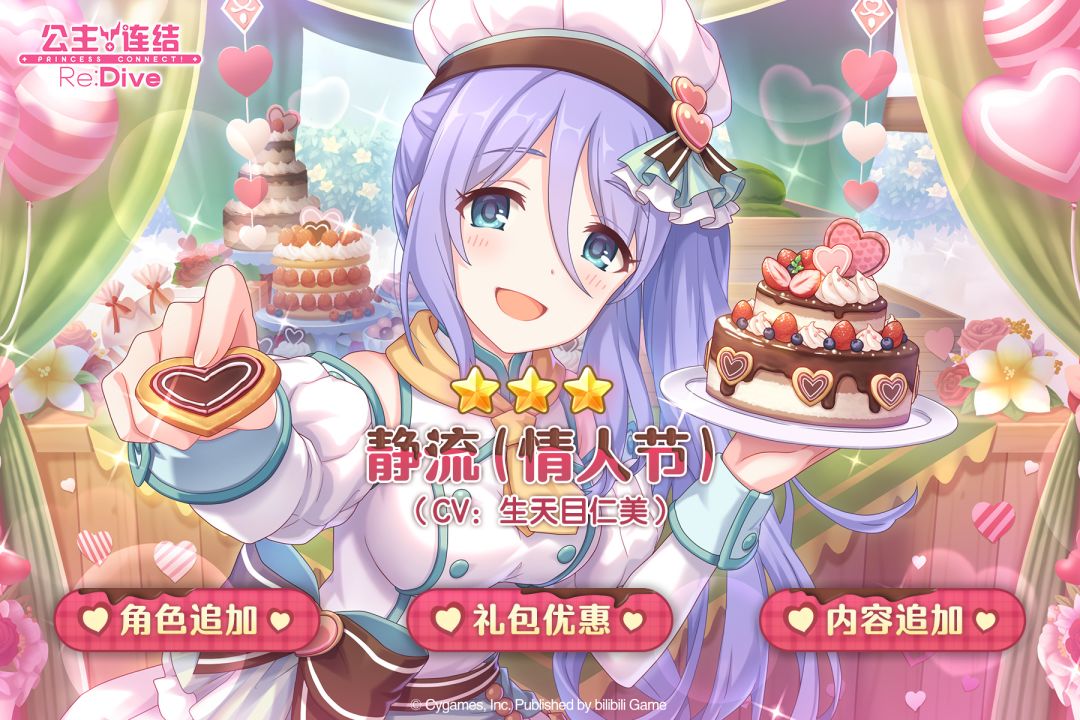 亲爱的各位骑士君: 我们预计于2月14日 11:00~14:00期间对全平台进行一次更新维护。 更新结束后,期间限定角色★3「静流(情人节)」(CV:生天目仁美)即将登场!游戏内将同时开启「静流(情人节)」 PICK UP扭蛋活动,上架「豪华扭蛋券礼包」;同时,还将追加新的角色专用装备! 详细活动日敬请点击下方图片查看↓ 今后也请多多支持《公主连结Re:Dive》!