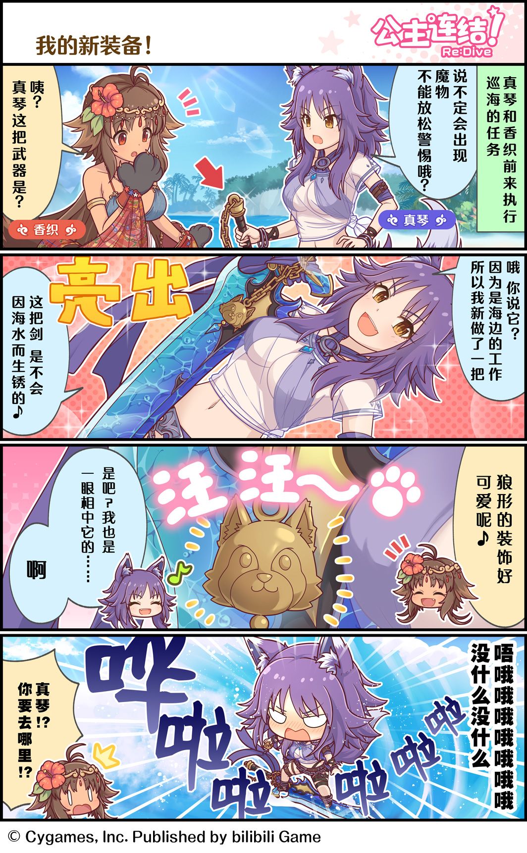真琴在海边换上了崭新的武器, 香织夸赞了新武器上狼形的装饰非常可爱,但是……