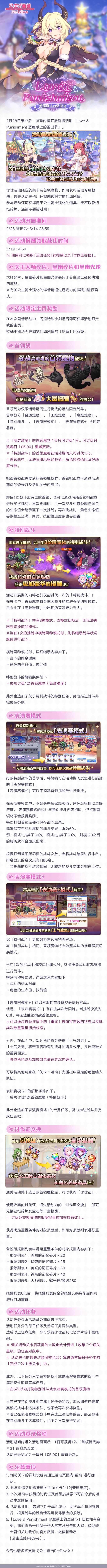 亲爱的各位骑士君:2月28日维护后,游戏内将开展剧情活动「Love & Punishment 恶魔献上的圣诞节」!并将同步开展「活动关卡玩家经验值获得量提升庆典」&「活动关卡掉落量2倍庆典」!※庆典开展时间及详情请见后续官方公告。■活动时间2/28 维护后~3/14 23:59讨伐活动限定的关卡及首领魔物,即可获得活动专属报酬,还可以解锁限定的活动剧情哦。活动详情敬请查看下方长图↓■