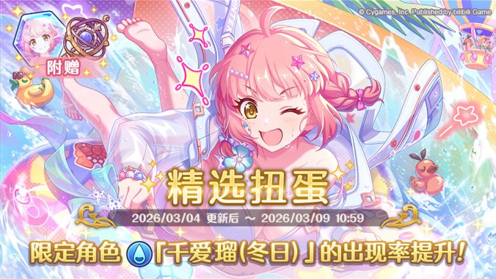 「人家是不受季节约束的美人鱼!世界级美少女千瑠瑠!」3月4日更新后,期间限定角色★3千爱瑠(冬日)(CV:佐仓绫音)正式登场!「★3千爱瑠(冬日)」出现概率提升的精选扭蛋同步开展中!还请骑士君们不要错过哦♪