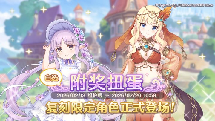 2月13日维护后,复刻限定角色附奖扭蛋正式开启!附奖扭蛋中,期间限定角色★3「镜华(春日)」、★3「咲恋(沙漠)」的出现概率提升!