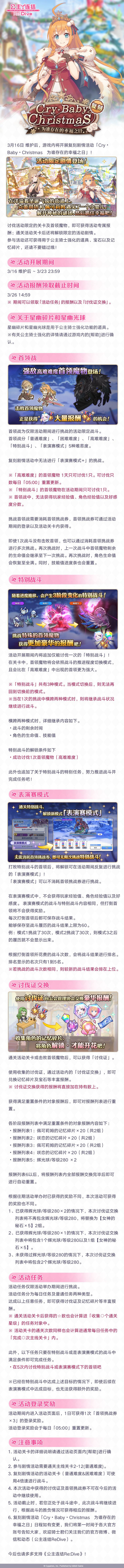 亲爱的各位骑士君:3月16日维护后,游戏内即将开展复刻剧情活动「Cry・Baby・Christmas 为谁存在的幸福之日」!并将同步开展「活动关卡玩家经验值获得量提升庆典」&「活动关卡掉落量2倍庆典」!※庆典开展时间及详情请见后续官方公告。■活动时间3/16 维护后~3/23 23:59讨伐活动限定的关卡及首领魔物,即可获得活动专属报酬,还可以解锁限定的活动剧情哦。活动详情敬请查看下