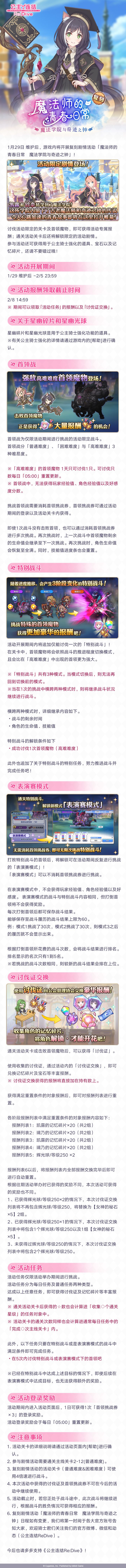 亲爱的各位骑士君:1月29日维护后,游戏内即将开展复刻剧情活动「魔法师的青春日常 魔法学院与奇迹之钟」!并将同步开展「活动关卡玩家经验值获得量提升庆典」&「活动关卡掉落量2倍庆典」!※庆典开展时间及详情请见后续官方公告。■活动时间1/29 维护后~2/5 23:59讨伐活动限定的关卡及首领魔物,即可获得活动专属报酬,还可以解锁限定的活动剧情哦。活动详情敬请查看下方长图↓■注意事项1