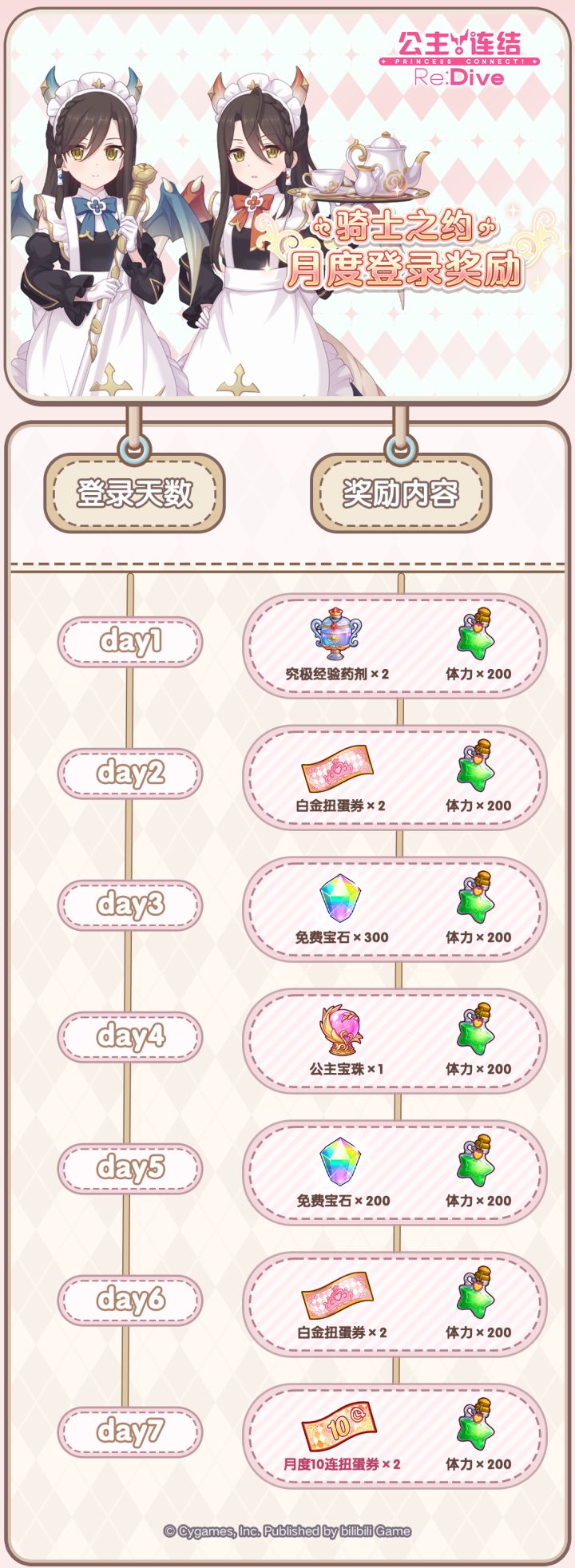 亲爱的各位骑士君:2月1日05:00,将开启「骑士之约」月度登录活动。活动期间每日登录游戏,即可获得月度10连扭蛋券、宝石以及体力等丰富奖励!■活动时间2月1日 05:00~3月1日 04:59■登录奖励内容「骑士之约」月度登录活动的奖励如图所示。注意事项1. 「骑士之约」月度登录活动于每月1日05:00开启,持续至下一个月1日04:59结束。期间内累计登录达一定天数即可获得对应奖励