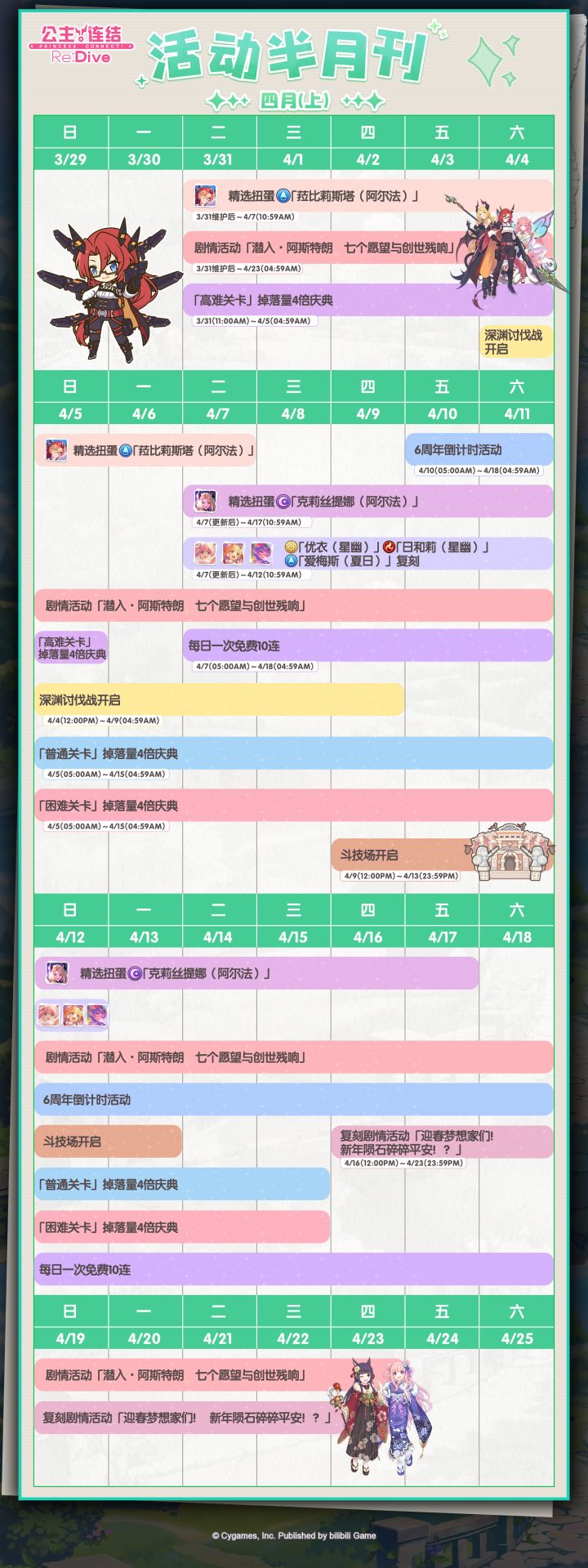 亲爱的各位骑士君:活动半月刊(四月上)已公布,请骑士君留意四月上旬常规活动的开展时间哦~※各活动详情敬请留意后续官方公告。今后也请多多支持《公主连结Re:Dive》!