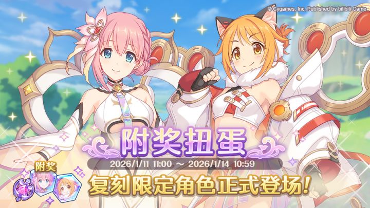1月11日 11:00起,复刻限定角色附奖扭蛋正式开启!附奖扭蛋中,期间限定角色★3「优衣(星幽)」、★3「日和莉(星幽)」的出现概率提升!