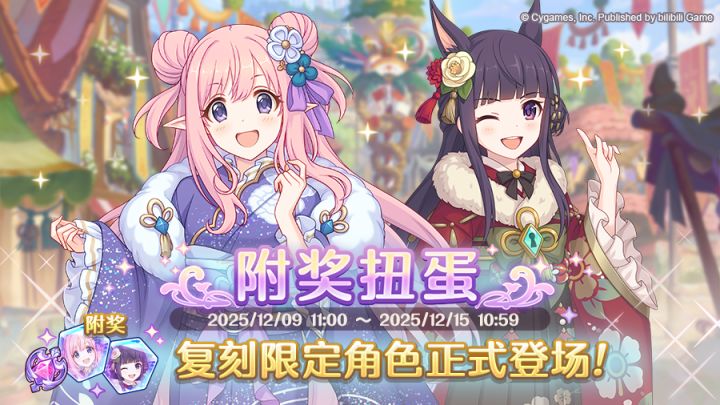 12月9日11:00起,复刻限定角色附奖扭蛋正式开启!附奖扭蛋中,期间限定角色★3「初音(新年)」、★3「香澄(新年)」的出现概率提升!