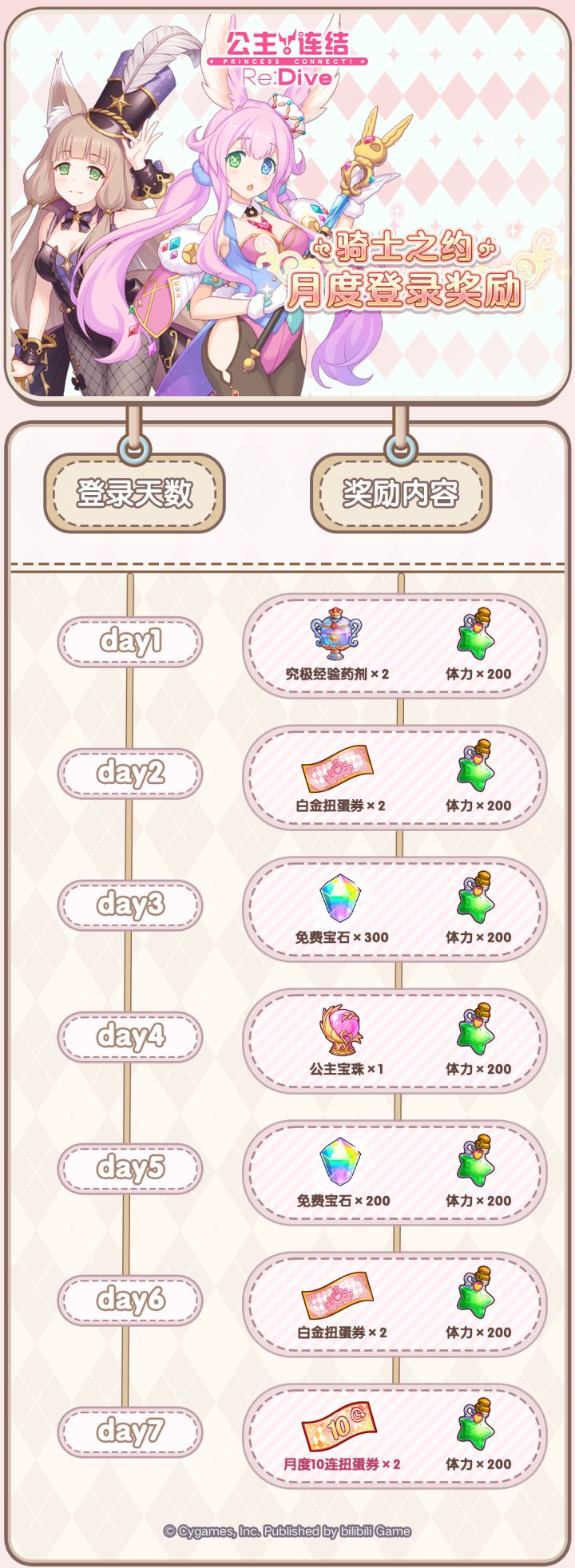 亲爱的各位骑士君:12月1日05:00,将开启「骑士之约」月度登录活动。活动期间每日登录游戏,即可获得月度10连扭蛋券、宝石以及体力等丰富奖励!■活动时间2025年12月1日 05:00~2026年1月1日 04:59■登录奖励内容「骑士之约」月度登录活动的奖励如图所示。注意事项1. 「骑士之约」月度登录活动于每月1日05:00开启,持续至下一个月1日04:59结束。期间内累计登录达
