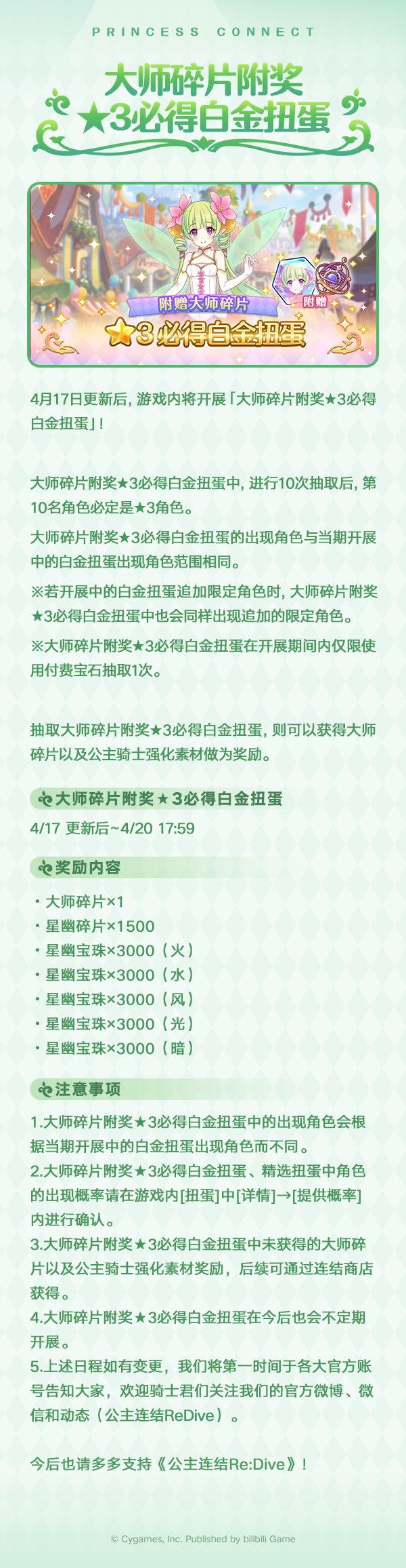 亲爱的各位骑士君:4月17日更新后,游戏内将开启★3角色出现率2倍的「公主庆典扭蛋」,期间限定角色★3「菲欧」(CV:相坂优歌)及公主庆典限定角色将在「公主庆典扭蛋」中限时登场,游戏内将开展★3必得白金扭蛋;开启6周年纪念 兰德索尔杯登录活动!详细活动日敬请点击下方图片查看↓今后也请多多支持《公主连结Re:Dive》!