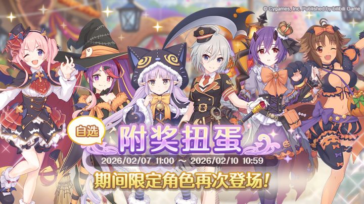 2月7日11:00起,自选复刻限定角色附奖扭蛋将正式开启!附奖扭蛋中,期间限定角色★3「镜华(万圣节)」、★3「智(万圣节)」、★3「美咲(万圣节)」、★3「忍(万圣节)」、★3「纺希(万圣节)」、★3「香织(万圣节)」将再次登场并作为「精选候补角色」出现!请不要错过哦~