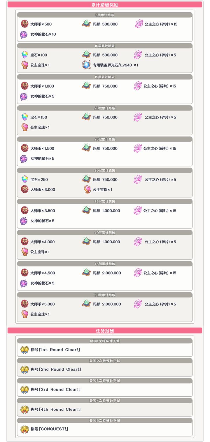 亲爱的各位骑士君: 9月9日05:00起,将举办「期间限定特别地下城」! 游玩「期间限定特别地下城」,收集特别装备,让角色能力更上一层楼吧! 对比上一期期间限定特别地下城,本次调整如下所示: ■变更敌人变更第6层~第9层的敌人。 其他有关特别地下城的详细信息如下所述。 ■举办期间9/9 05:00~9/14 04:59 ■参加条件【条件1】通关地下城「绿龙的骸岭(极难3)」【