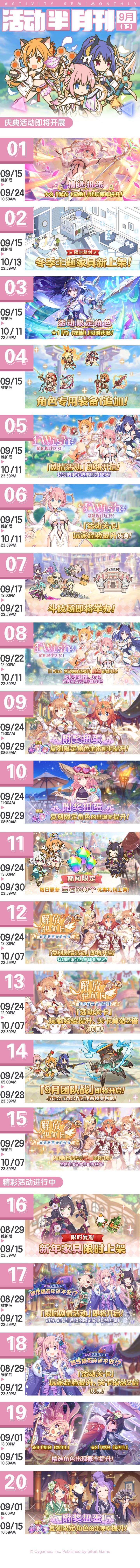 亲爱的各位骑士君:活动半月刊(九月下)已公布,请骑士君留意九月下旬常规活动的开展时间哦~※各活动详情敬请留意后续官方公告。今后也请多多支持《公主连结Re:Dive》!