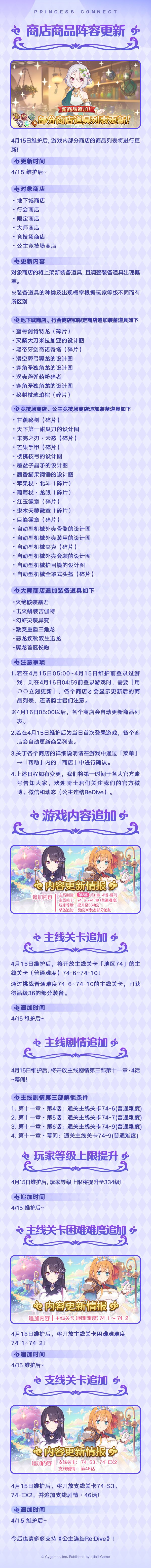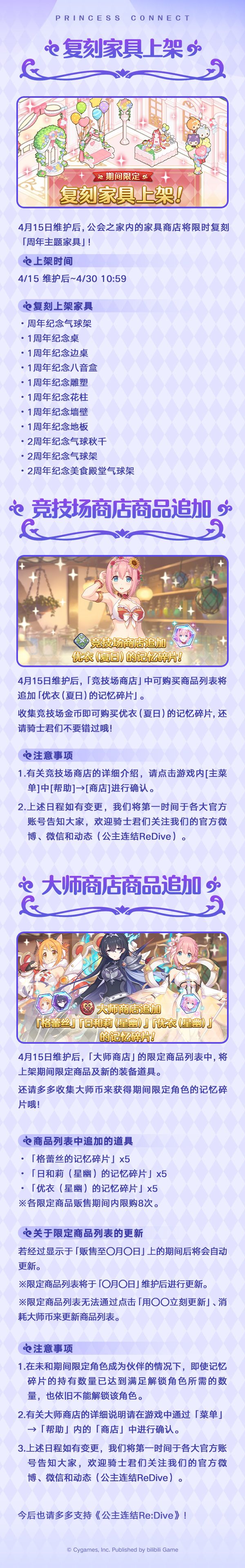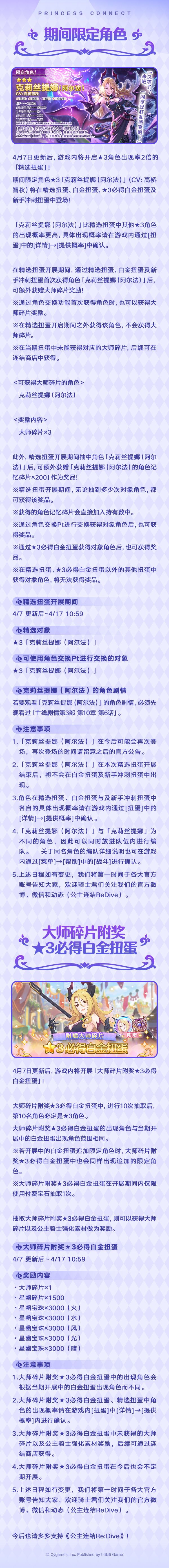 亲爱的各位骑士君:4月7日更新后,游戏内将开启★3角色出现率2倍的「精选扭蛋」,期间限定角色★3「克莉丝提娜(阿尔法)」(CV:高桥智秋)即将登场!同时,4月15日起,公会之家将限时复刻「周年」主题家具;竞技场商店、大师商店将上架新的商品道具,并追加新的游戏内容!详细活动日敬请点击下方图片查看↓今后也请多多支持《公主连结Re:Dive》!