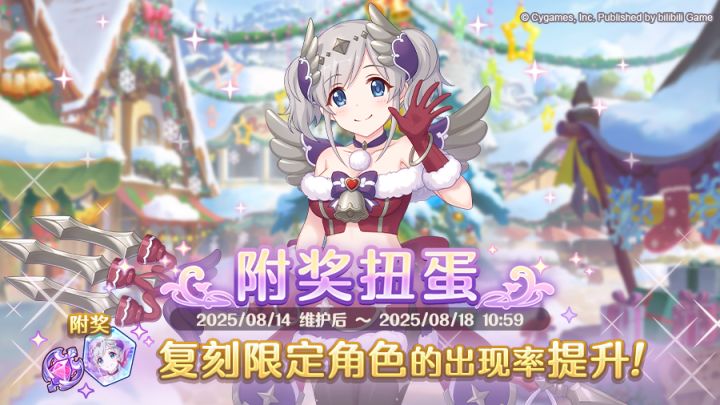 8月14日维护后,复刻限定角色附奖扭蛋将正式开启!附奖扭蛋中,期间限定角色★3「茜里(圣诞节)」的出现概率将进行提升!