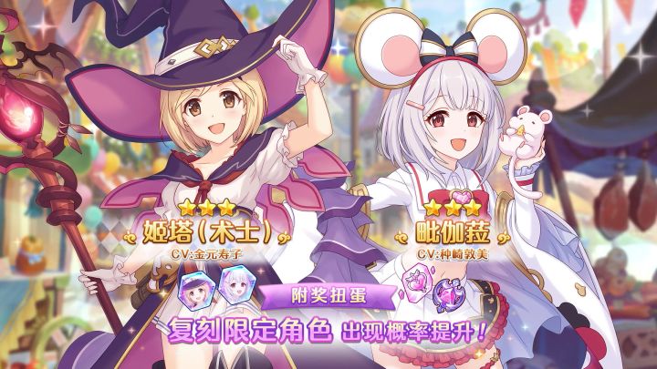 8月4日11:00起,复刻限定角色附奖扭蛋将正式开启!附奖扭蛋中,期间限定角色★3「姬塔(术士)」、★3「毗伽菈」的出现概率将进行提升!