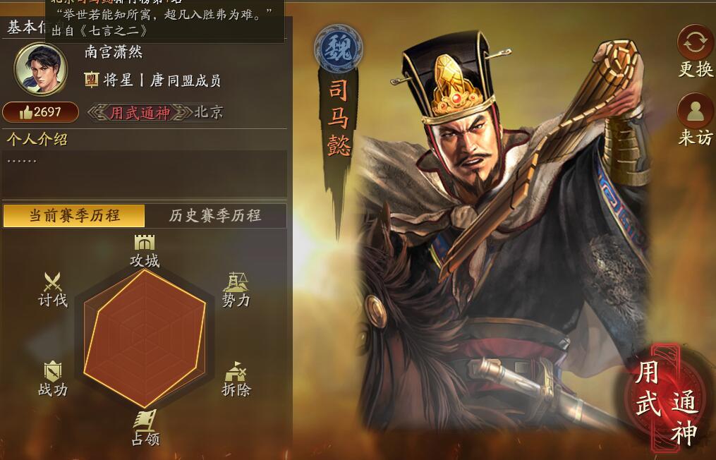 前言:本文首发【三战配将君小帮手】的公众号,未授权禁止“抄袭文章”到其他平台。 作者:三国志战略版配将君 大家好,我是三战配将君,每天帮你配将开荒冲榜,和你说求贤令的武将选择,希望能帮到你! 三国志战略版目前的环境里,说起司马懿的队伍都是太尉盾的玩法,曾经风靡一时的郝昭司马盾不知道在什么时候真的退出了舞台!相信很多玩家会在高红郝昭和白板满宠之间直接选择后者,然后开启太尉盾的玩法!可最近来自北京地区
