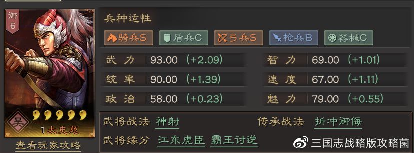 以下内容来自微博@三国志战略版攻略菌,系玩家意见非官方立场 文章要点: 1:武将简介 2:自带及传承战法分析 3:兵书与加点建议 4:开荒推荐 5:阵容推荐 6:优劣势分析 在吴国的大部分阵容中,你都能看到太史慈的身影,今天攻略菌就来带大家了解一下太史慈这位武将,希望对大家能有所帮助! 武将关键词常驻型连击、武智双修的男人 战法搭配各种突击战法 武将定位可暴力可辅助,论突击战法的数十种用法 一、武
