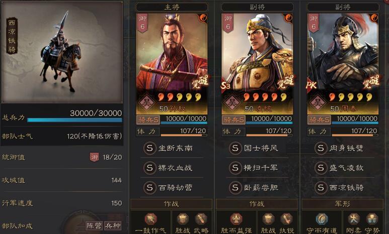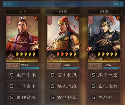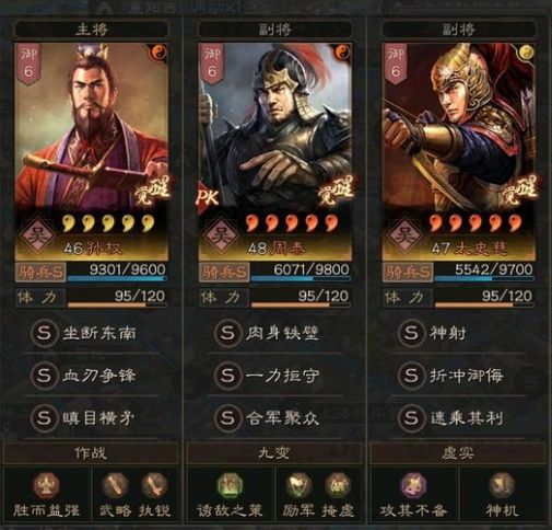 三国志战略版孙权虎豹骑,0损打赢满红甘太程,完爆蜀骑五虎枪! 大家好,我是三战配将君! 三国志战略版孙权虎豹骑玩法大神玩家都不会陌生,不过很多玩家刚抽到孙权或者刚经历S4赛季,新武将周泰才刚拿到手,那么在有凌统和对应战法的情况下,完全可以考虑一下这个阵容的配置,希望能帮到你! 三国志战略版周太程肉弓——孙权+周泰+凌统 (主将)孙权,战法搭配:当锋摧决+兵无常势 (副将)凌统,战法搭配:裸衣血战+