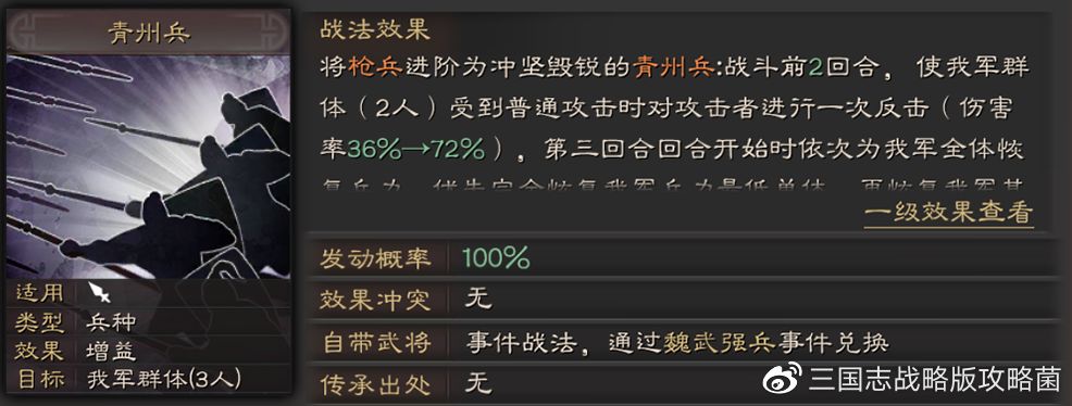 以下内容来自微博@三国志战略版攻略菌,系玩家意见非官方立场 文章要点: 1:战法简析 2:阵容推荐 3:战法对比 4:实战效果 青州兵即为天下雄兵,震撼三秦,横扫诸夏,攻守合一,熠熠生辉。今天就给大家带来青州兵的深度解析! 一、前言 时在初平三年(192年)十二月,黄巾流寇连带家属数百万,入青州劫掠良民。曹操奉旨讨伐贼兵,降卒三十余万,收其精锐者,号为青州兵。 青州兵即为天下雄兵,震撼三秦,横扫诸