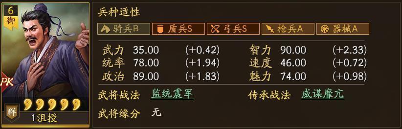 一、武将面板属性分析 游戏中的定位:能够延长负面时间的谋略辅助 沮授从属性方面看,是个标准的短腿法师,智力方面属于二线谋士水准,速度就不提了,但是统率不错,综合属性一看,还是比较亮眼,属于谋士中的佼佼者。 适性方面,除了骑兵不太建议,其他都还ok。 二、战法分析 自带战法: 乍一看,沮授的战法平平无奇,给队友的负面效果增加1回合,还是有概率的,同时混乱伪报还不生效,并且还得依赖普攻才能打出伤害或