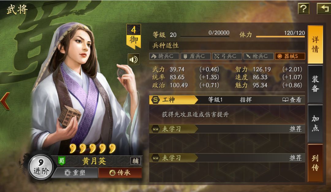 前言 黄氏,本名不详,三国时荆州沔南白水人(今湖北襄阳),沔阳名士黄承彦之女,诸葛亮之妻。传说名为黄月英(最早或出自袁阔成的评书《三国演义》)。 其人记载见《襄阳耆旧记》,其父称其长相丑陋、黄头发、黑皮肤,但才华却与诸葛亮相称 。乡间有“莫作孔明择妇,正得阿承丑女”的谚语流传。 正文 在游戏中,黄月英虽然有着S器械的兵种适性,但是其他兵种适性皆为C。这导致,如果黄月英拿上战场,不当器械的话,将会损