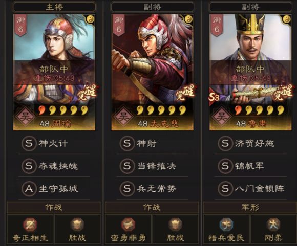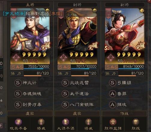 一、本期内容 大家好,我是老白,今天给大家推荐的是一队很传统的吴国弓兵队伍,由老周瑜陆逊程普组成,我个人看来相比于社稷弓的的蛇皮周瑜,我更喜欢这一队,不管是稳定性还是其他各方面这一队毋庸置疑都高于社稷,社稷在我的看来是给了足够多的战法,但是打出来的效果其实也并不尽人意,除非真就是满配的情况下,大家也都知道,这样一支队伍是多么的占用战法,老周瑜这一队相比之下给到战法的同时发挥的稳定性其实也更好,只