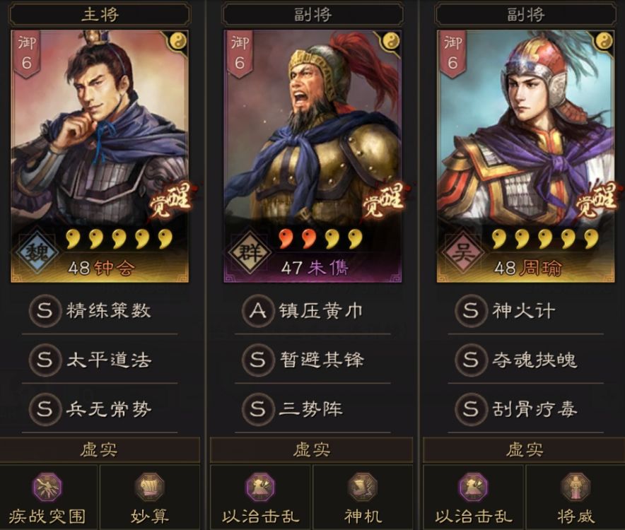 一、阵容分享 三战玩得久了,发现玩来玩去都是那几个同样的队伍,渐渐的就会没啥兴趣了,所以鄙人总爱研究一些新奇的队伍,今天给各位带来的一队三势钟会,钟会这个武将大多人都不会太在意,因为兵种的属性以及队伍的组合总找不到合适的阵容,渐渐的就被众人排除到了视线之外。好了,废话少说,直接上今天的干货。 钟会:太平道法+兵无常势 兵书:疾战突围+妙算 加点:主加智力,适当增速,根据实战来给 朱儁:暂避其峰(无