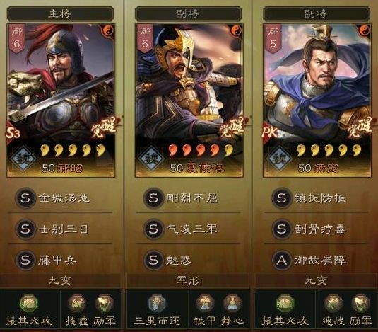 一、前言 大家好,我是老白,今天给大家分享的阵容是夏侯惇的反击盾,相信很多小伙伴也撞上或者正在玩这一队,强度还是蛮值得推荐的,很适合平民玩家组着玩,这一队了我在很早以前就看到过有小伙伴玩,到目前在战场上也会或多或少的撞上这支队伍,下面给大家分享一下搭配以及个人的一些见解; 二、阵容搭配 曹操:暂避/御敌 军民 全统 夏侯惇:气凌/绝地/后发 众动万技 全武(盾宝物) 满宠:刮骨 陷阵/藤甲 全智