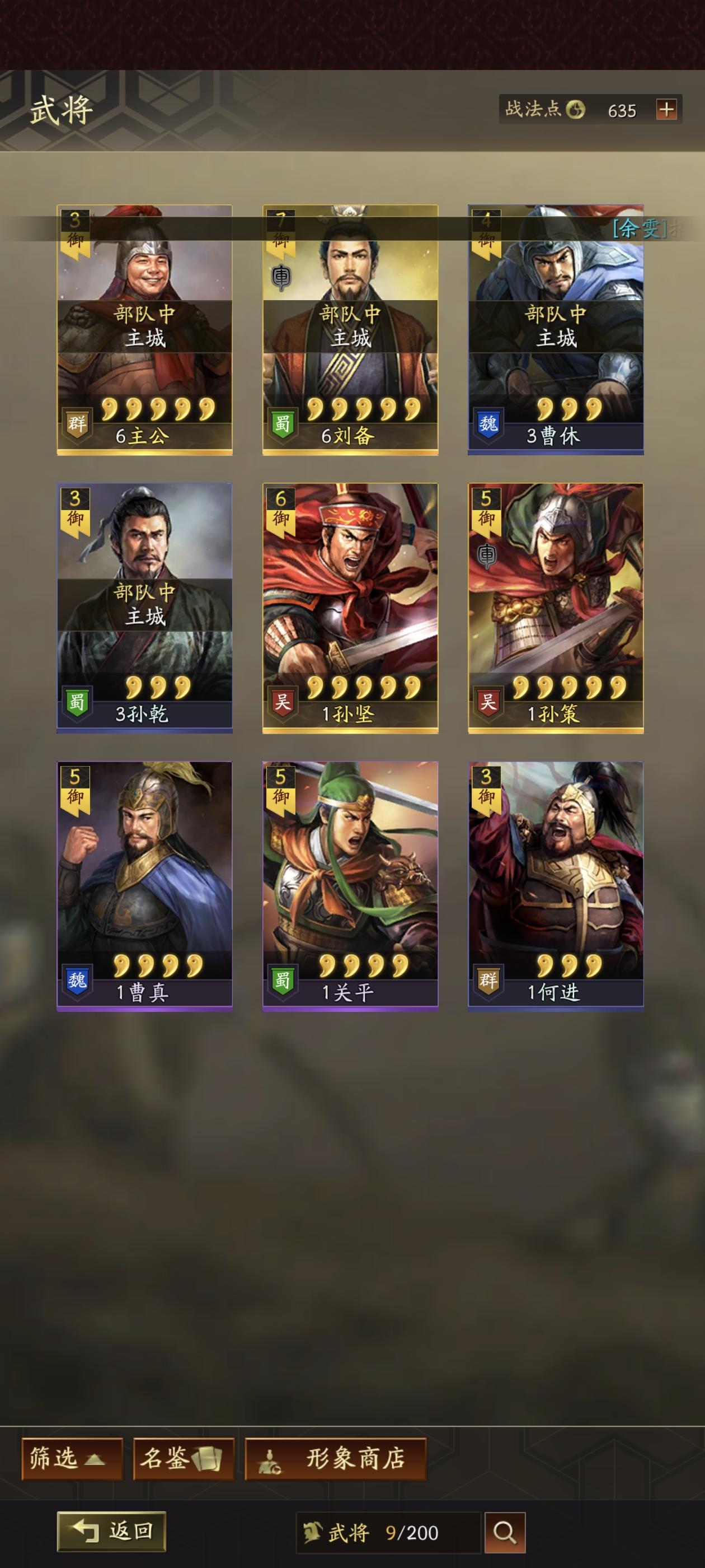 首先·进入游戏由于我是0氪,只能用紫色将开荒,至于第一橙是第二天抽到的田丰,我感觉没法搭配就继续用紫色开荒,紫色将如下图:一直用他们三开到七级地,就使劲砍。终于!在接下的天数下,程昱陈到曹操陆续都来了。不过我手上的橙依旧无法组一队s骑兵,毕竟曹操程昱都是s骑兵,我就想着走s骑兵组队。还有就是上面的紫色三兄弟打七太伤了,估计是无法接下来打八,七铜之类的,我就想着转型了。并且我发现这个紫色的纪